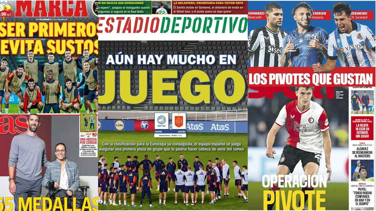 Las portadas de la prensa deportiva de este jueves vienen marcadas lógicamente por el partido que la Selección Española disputa esta tarde (18:00 horas) en Chipre, correspondiente a la fase de clasificación para la Eurocopa. La Roja ya tiene certificado su pase para esta cita, pero quiere conseguir la victoria para terminar primeros de grupo con lo que esto supone.