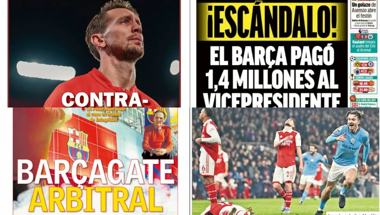 Por todo ellos, la prensa madrileña como el diario Marca y el diario As no dudan en llevarlo a su primera página con un titular contundente. '¡Escándalo! El Barça pagó 1,4 millones al vicepresidente de los árbitros', dice Marca, mientras que As titula: 'Barçagate arbitral'. Sin embargo, la prensa deportiva de Barcelona no se hace eco de dicha investigación, centrando sus portadas en el partido que esta tarde disputarán el Barça y el Manchester United en la ida de los playoff de la Europa League.