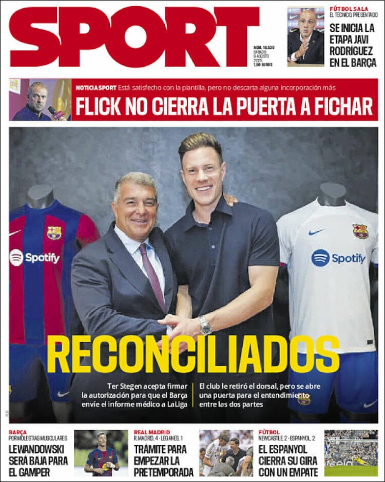 Las portadas deportivas de este sábado 9 de agosto de 2025 vienen marcadas por la reconciliación de Marc André Ter Stegen con el Barça para firmar el informe médico y recuperar la capitanía del conjunto blaugrana. También se trata la renovación de Gonzalo García, el futuro de Rodri o el fichaje de Raspadori.
