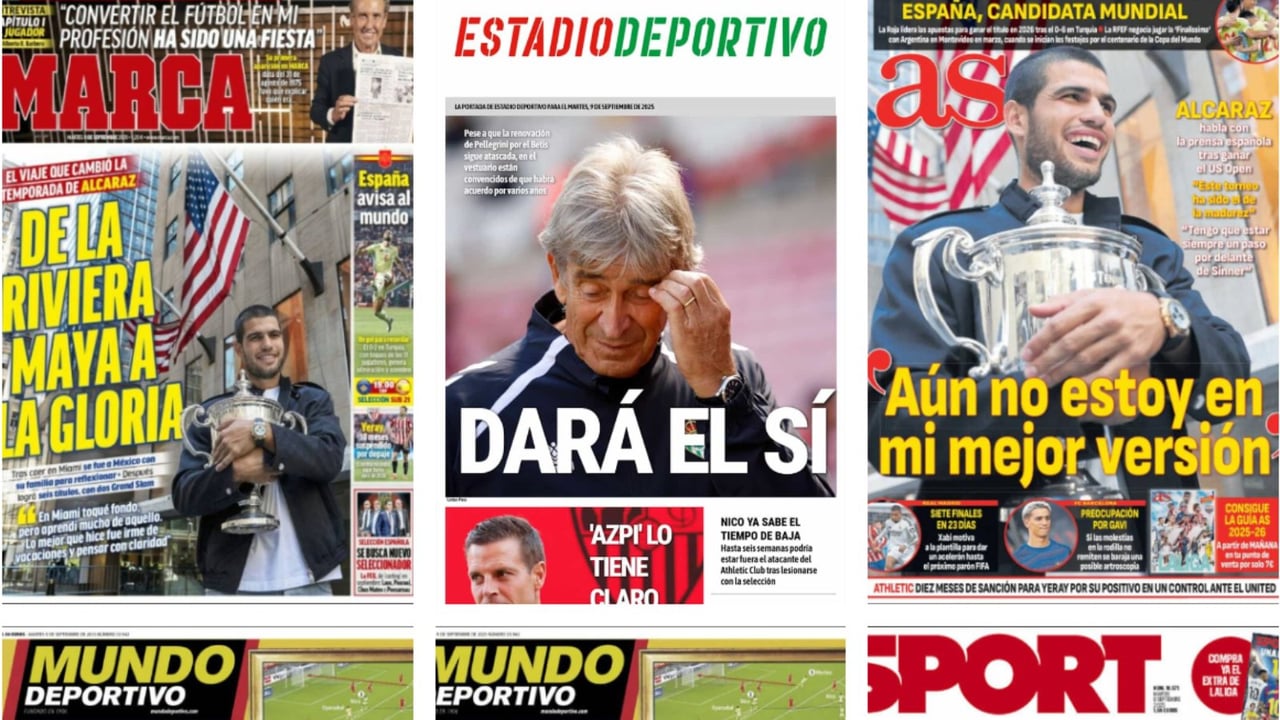 La atascada renovación de Pellegrini, la crisis que atraviesa el Athletic Club y los nuevos retos de Carlos Alcaraz son los protagonistas de las portadas de la prensa deportiva española en este martes 9 de septiembre de 2025.