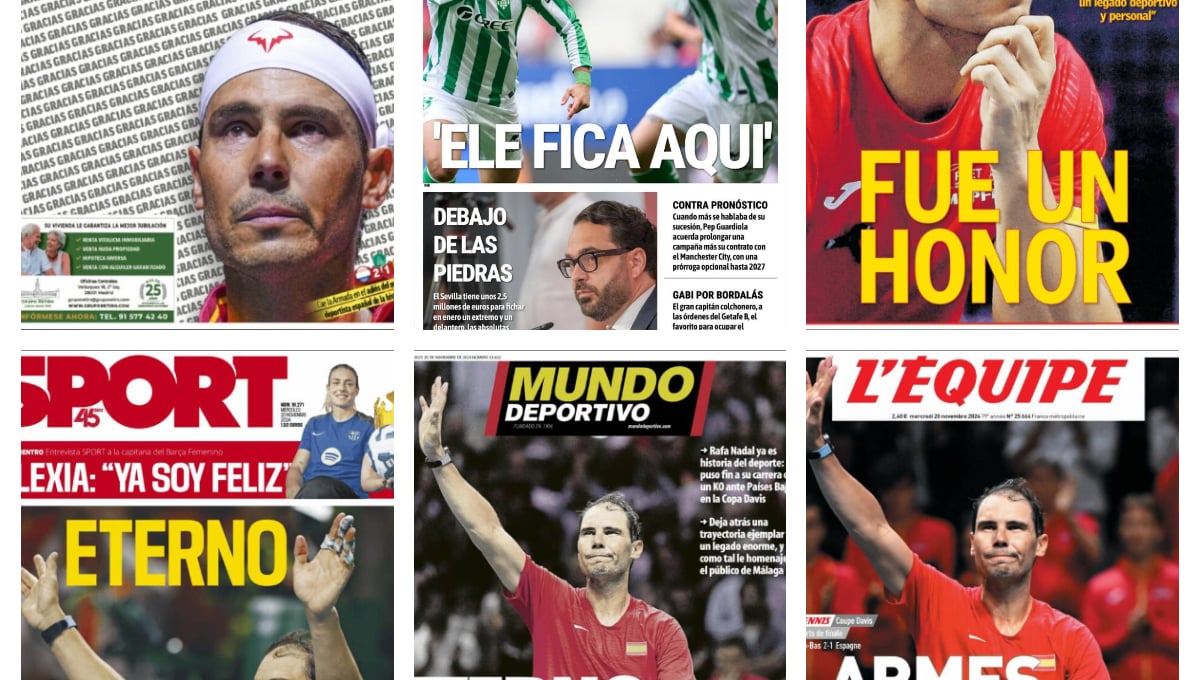 La retirada de Rafa Nadal copa todas las portadas de los principales medios de comunicación en España. En Francia, L'Equipe se hace eco de este histórico acontecimiento. Los goles de Vitor Roque y el mercado de fichajes del Sevilla también tienen un hueco