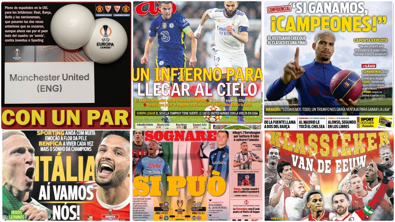 Lo mismo le ocurre al Real Madrid en la Champions League. Le ha tocado el Chelsea FC y en las semifinales le tocaría contra el ganador del apasionante duelo entre Bayern Múnich y Manchester City; en ambas eliminatorias con la ida en el Santiago Bernabéu y la vuelta fuera. 'Un infierno para llegar al Cielo' refleja la portada del diario AS, mientras que Marca resalta que los blancos van 'Sin red hasta la final' aunque apuesta por abrir en primera página con el duelo del domingo: 'LaLiga pasa por el Clásico'. De cara a ese partido, las noticias en Barcelona son la lesión de Pedri y las ganas de Ronald Araújo, que ha concedido entrevistas para Mundo Deportivo, Sport y L'Esportiu.
