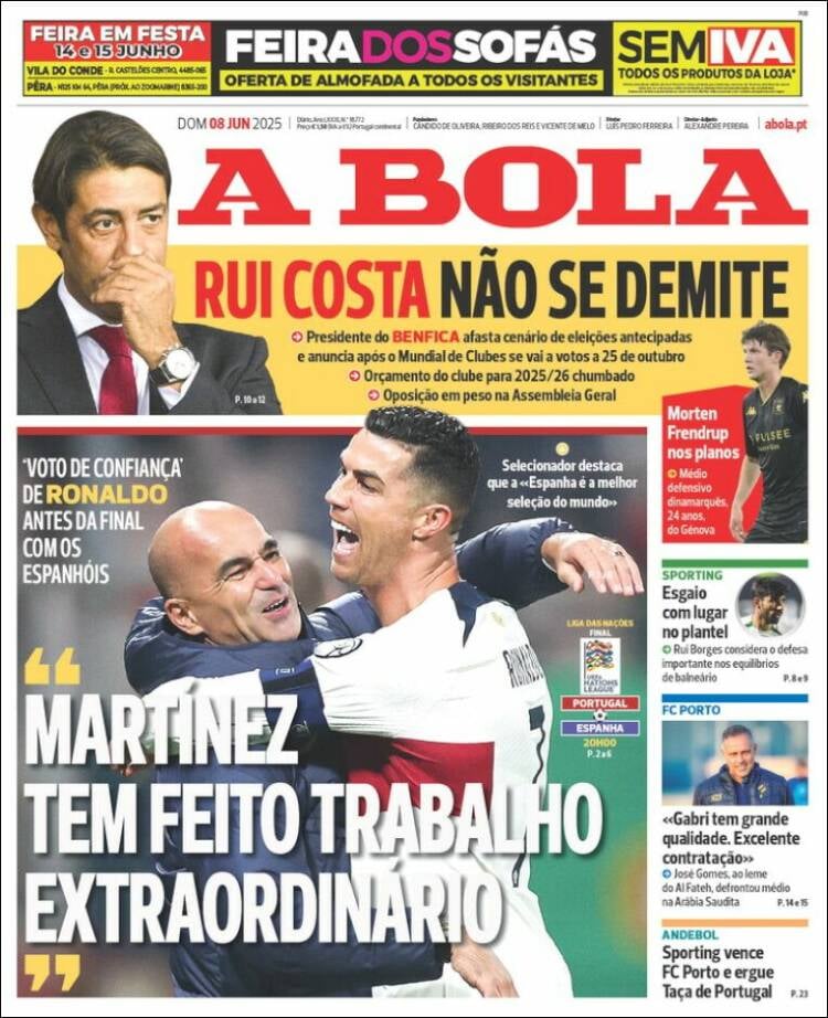Por último, en la prensa internacional, A Bola da mucho protagonismo a la final que jugará la Portugal de Cristiano Ronaldo; pero sin perder de vista la situación de Rui Costa, actual presidente del Benfica. Por su parte, en Italia, La Gazzeta dello Sport abre su cabecera con la posible salida de Luciano Spalleti de la Selección Italiana.