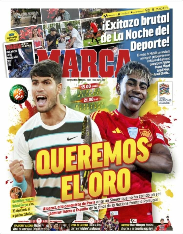 En pleno parón de selecciones, la temática principal de todas las cabeceras en España destacan la gran final de la Nations League entre 'La Roja' y Portugal. Además, el enfrentamiento entre Carlos Alcaraz y Sinner en la última instancia de Roland Garrós también copa importancia en las portadas este domingo