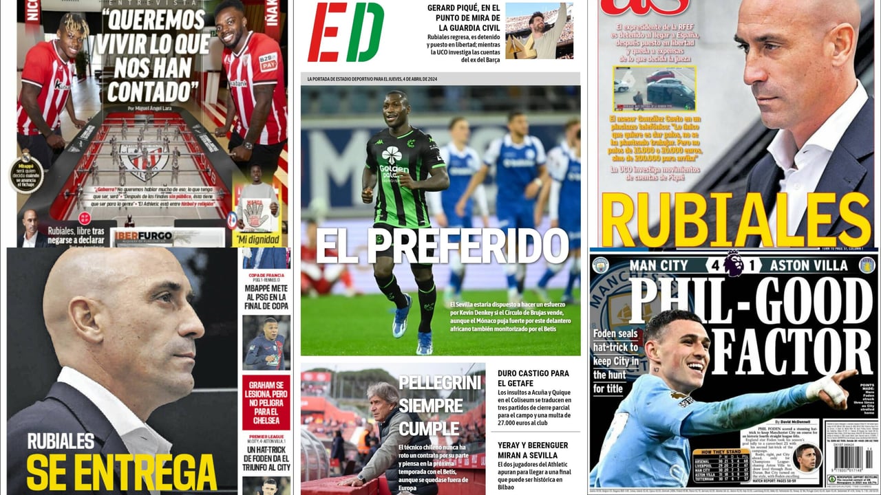 Las portadas de la prensa deportiva de este jueves 4 de abril de 2024 llegan cargadas de información y con un claro protagonista: Luis Rubiales. El expresidente de la Real Federación Española de Fútbol regresó ayer a España, fue detenido, le tomaron declaración y puesto en libertad dentro del marco de la 'operación Brody' y ahora la Guardia Civil también apunta a Gerard Piqué. Ellos se cuelan en las portadas de As, Sport y Estadio Deportivo.