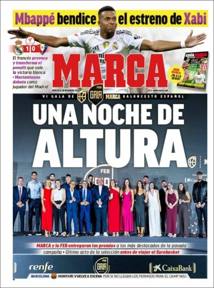En las portadas madrileñas se hace mención principalmente a la victoria del Real Madrid en la noche de ayer en su debut liguero ante Osasuna (1-0) con un solitario gol de Mbappé en un penalti que ha generado dudas en algunos espectadores. También es tema destacado el hecho de que Carlos Alcaraz pueda salir del US Open siendo número 1 del mundo en detrimento de Sinner y que la selección española de baloncesto no esté entre las 10 principales favoritas para hacerse con el Eurobasket.