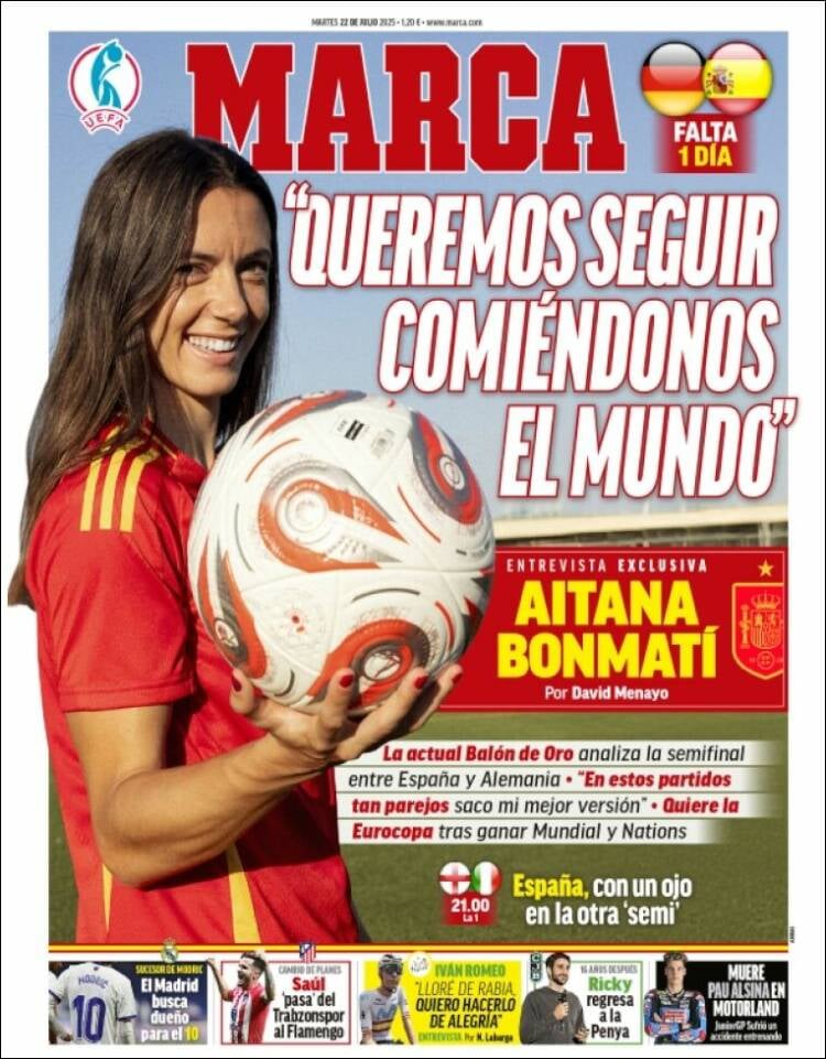 En los diarios madrileños apuestan por las entrevistas previas a la semifinal de la Eurocopa a Aitana y Alexia. En el Marca se hace mención también al relevo del '10' en el Real Madrid tras la salida de Modric y al cambio de planes de Saúl Ñiguez, que finalmente parece que firmará por el Flamengo brasileño y no por el Trabzonspor. En el AS, además de la entrevista, mencionan la intención de Gonzalo García de apostar por el Real Madrid mientras llegan ofertas de la Premier League y la llegada de Morata al Como de Cesc Fábregas.