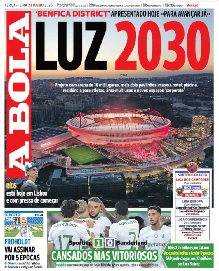 En los medios portugueses, A Bola hace referencia a la reforma del entorno del estadio Da Luz de cara al Mundial 2030 y la llegada de Richard Ríos al club encarnado. El diario Record abre con la victoria del Sporting CP en su partido amistoso ante el Sunderland y la cercana llegada de Luis Suárez del Almería y en O Jogo se menciona la operación de Joao Felix y abre con el fichaje de Froholdt por el Oporto.