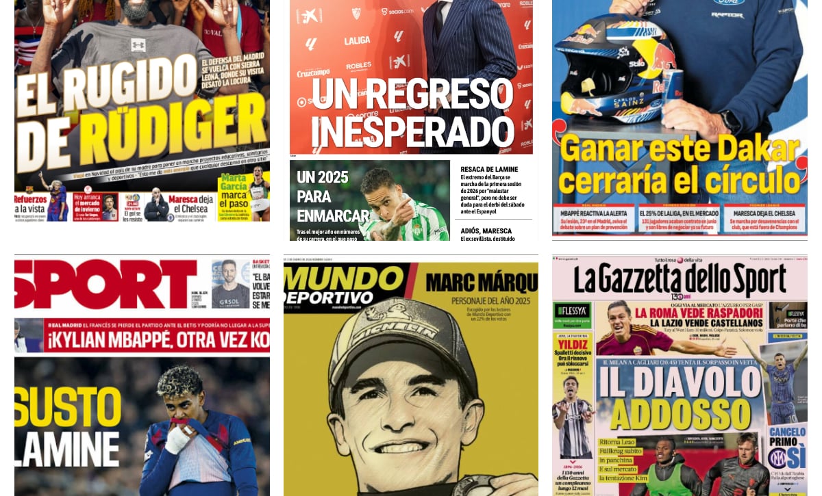 Mundo Deportivo encabeza su portada con Marc Márquez, siendo escogido por los lectores del medio como el personaje del año 2025. El diario SPORT aparece con la preocupación ante la baja de Lamine Yamal en los primeros entrenamientos del año a causa de un malestar general.