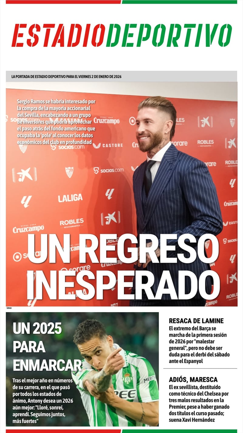 El gran titular del día es “Un regreso inesperado”, protagonizado por Sergio Ramos. El diario destaca el interés del ex capitán del Sevilla FC en adquirir la mayoría accionarial del club, encabezando un grupo de inversores. Esta posible operación cobraría fuerza tras el paso atrás de un fondo americano, que estaba bien posicionado, al conocer en profundidad la situación económica de la entidad hispalense.