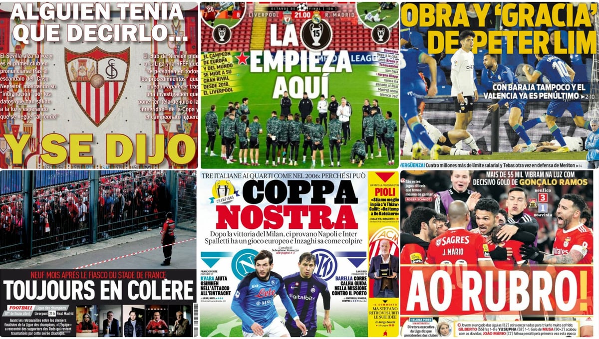 Por su parte, el Real Madrid visita este martes (21:00 horas) al Liverpool inglés, en un duelo correspondiente a la ida de octavos de final de la Liga de Campeones 2022/2023, que deberá afrontar con bajas importantes y que servirá para medir la mejoría y el deseo del equipo blanco por su competición fetiche ante un rival que querrá revancha y que se aferra a Anfield y a la Champions para salvar una temporada decepcionante. 'La 15ª empieza aquí', con una imagen del entrenamiento de los merengues en Anfield, titula la portada de Marca; mientras que AS abre con una foto de Karim Benzema (entró en la lista pese a sus molestias) y un 'Noche de Campeones'.En Barcelona, donde siguen haciendo mutis sobre el 'Caso Negreira', habló Ansu Fati, que espera renovar su contrato y pasar muchos años más como culé. El delantero internacional copa las portadas de Mundo Deportivo y Sport; mientras que la de Superdeporte carga contra la situación del Valencia CF, penúltimo en la tabla tras caer en el Coliseum: 'Por obra y gracia de Peter Lim'.