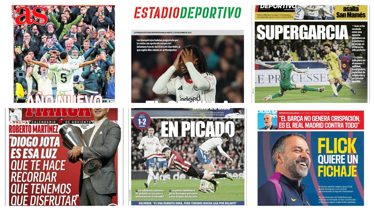 El Sevilla FC, el Real Madrid y el Barcelona protagonizan las portadas de la prensa deportiva en España a 23 de diciembre de 2025. El año llega a su fin y con el comenzará el mercado de fichajes, que será clave para conocer el objetivo sevillista hasta final de temporada. El Real Madrid, por su parte, busca una cambio de dinámica y mentalidad para 2026 con Xabi Alonso cuestionado. La vida en Barcelona es mucho más placentera ya que los azulgranas se consolidan como campeón de invierno. Gran parte de la 'culpa' recae sobre Joan García que ha firmado un primer tramo de temporada espectacular.