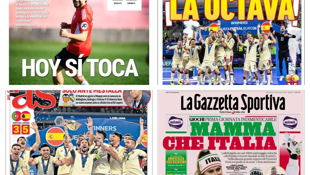Sevilla y Girona un día más tarde, España reina en el futsal, el Real Madrid se la juega, la Super Bowl...así vienen las portadas