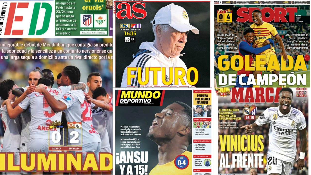 Las portadas de la prensa deportiva de este domingo 2 de abril de 2023, Domingo de Ramos, llegan cargadas de información y en medio de una nueva jornada de LaLiga, la 27ª, en la que el líder, el FC Barcelona, no falló en su visita al colista de la categoría y al que goleó con tantos de Robert Lewandowski, que hizo dos, Ansu Fati y Ferran Torres. El Barça cerró la jornada pero la abrió el derbi catalán entre el Girona y el Espanyol que llevó el conjunto gerundense gracias a un penalti en el 88' y que deja muy tocada la figura de Diego Martínez en el banquillo 'perico'.