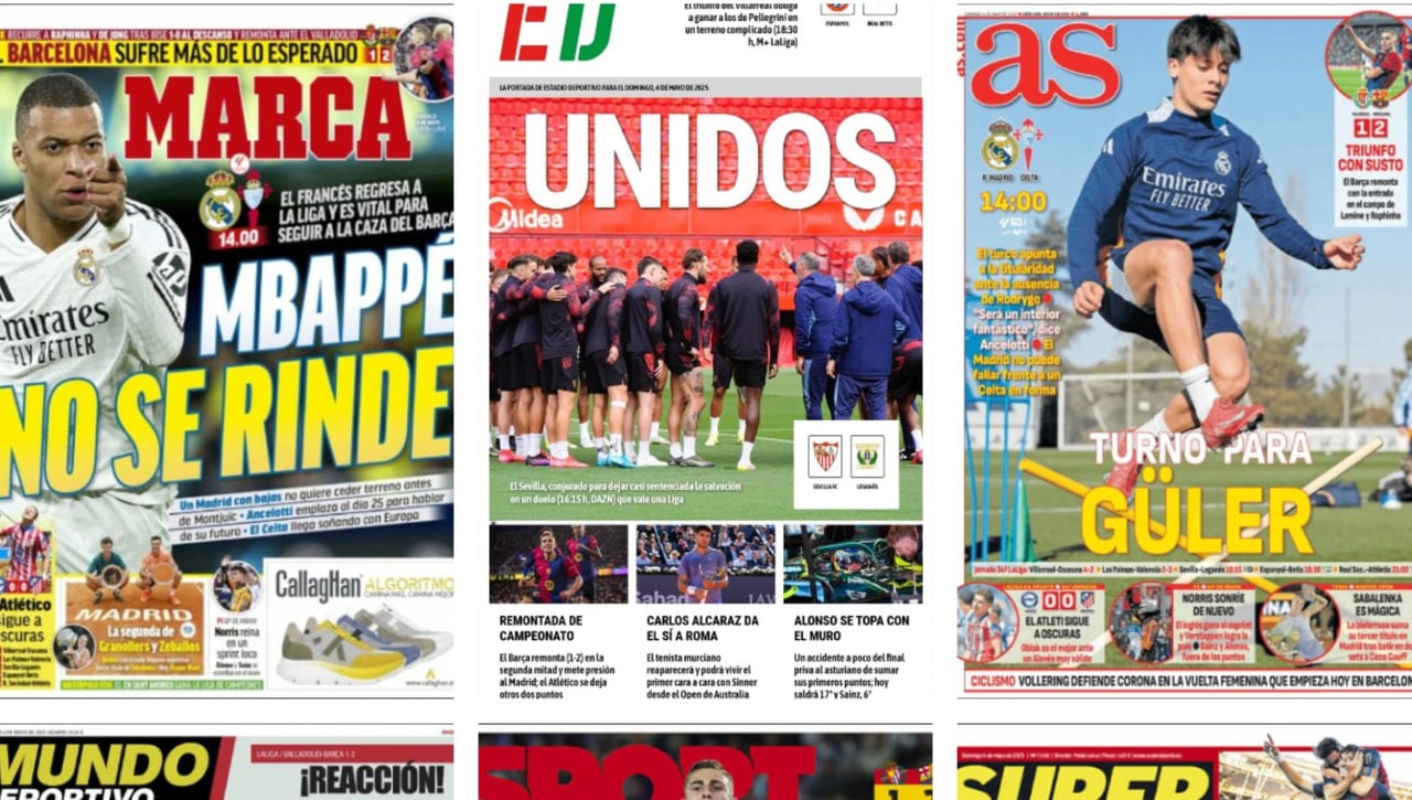Sevilla, Barcelona y Valencia acaparan las portadas de los medios deportivos nacionales en la mañana del 4 de Mayo de 2025. LaLiga llega a sus últimos compases y los equipos se lo juegan todo en la recta final del campeonato, como es el caso del Sevilla. Los de Nervión tienen una oportunidad de oro de certificar la permanencia en el Sánchez Pizjuán ante el Leganés y dar así la temporada por finalizada. El Barcelona, por su parte, sufrió más de lo esperado ante el Valladolid y Hansi Flick tuvo que sacar al José Zorrilla la artillería pesada para darle la vuelta al marcador. Por otro lado, el Valencia cosechó una nueva victoria y se cuela en la lucha por Europa gracias, en gran parte, a un doblete de Hugo Duro.