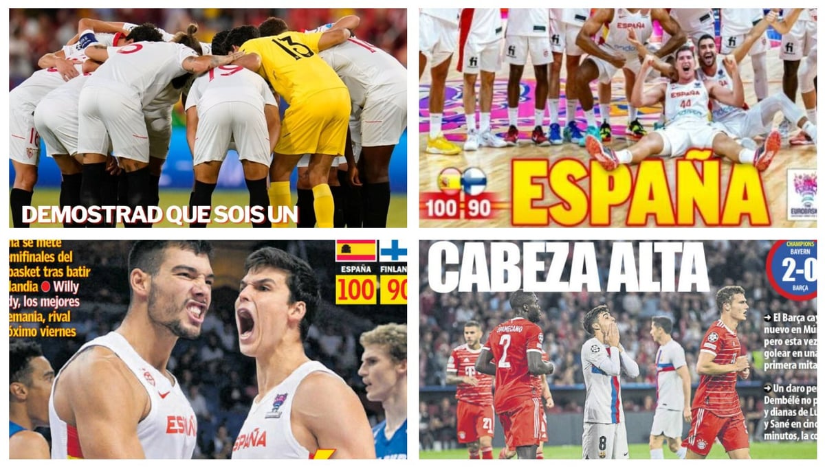El Sevilla está obligado a ganar al Copenhague, la ambición de Rodri, Canales y Álex Moreno, la selección española de baloncesto... así llegan las portadas de este miércoles 14 de septiembre de 2022 en el que la información deportiva está condicionada por la jornada de competición europea, tanto en UEFA Champions League como en UEFA Europa League. A su vez, se destaca un nuevo triunfo de la selección española de baloncesto que volvió a meterse en semifinales de una gran competición, del Eurobasket ahora, y sueña con todo.
