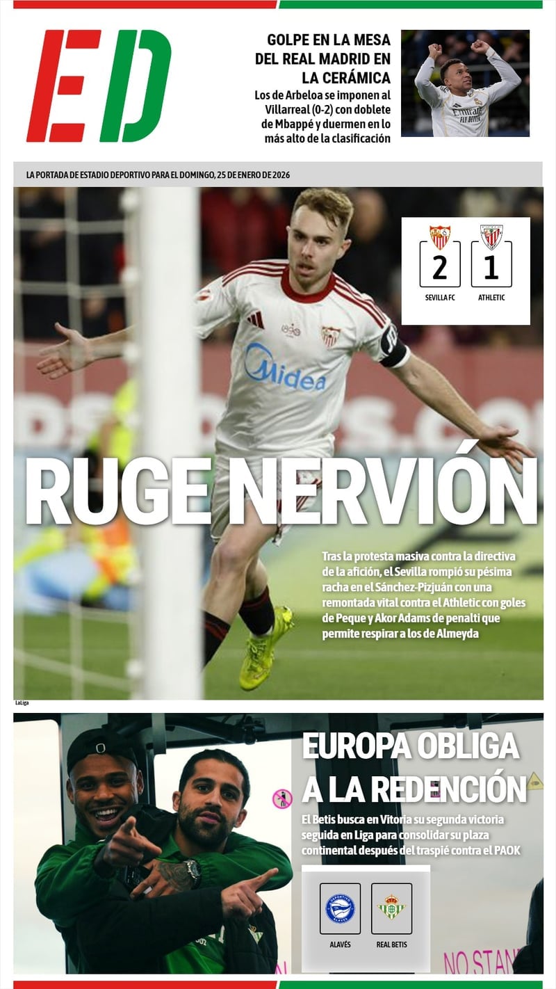 La portada de ESTADIO Deportivo de este domingo 25 de enero de 2026 está protagonizada por la victoria del Sevilla en Nervión. Tras la protesta masiva de la afición contra la directiva, los de Almeyda remontaron contra el Athletic gracias a los goles de Peque y Akor Adams, este último de penalti.