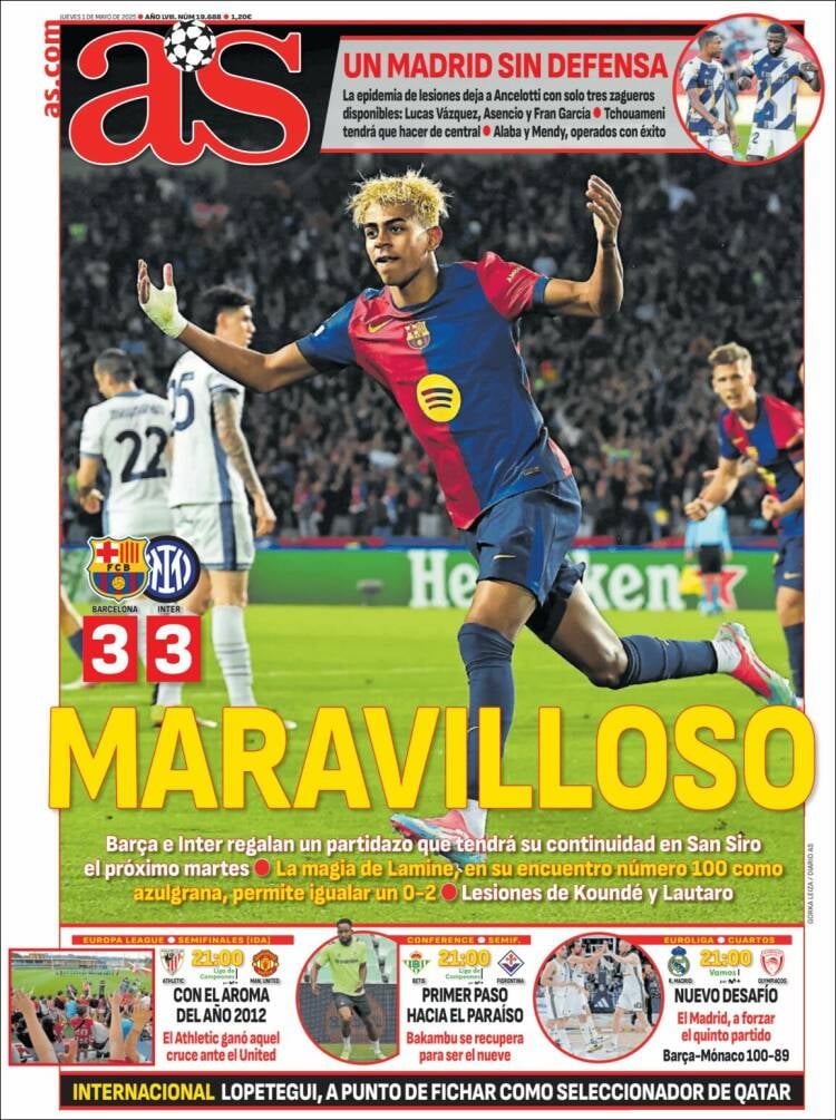 Las portadas deportivas de este jueves 1 de mayo de 2025 vienen marcadas por los partidos de ida de la máxima competición a nivel de clubes. El FC Barcelona y el Inter de Milán firmaron las tablas en Montjuic en una auténtica 'oda al fútbol'. Lamine Yamal fue el jugador más destacado del encuentro, y anotó un 'golazo' en el peor momento del equipo de Flick. Además, la decisión de Carlo Ancelotti y el Real Madrid son otros de los temas del día.