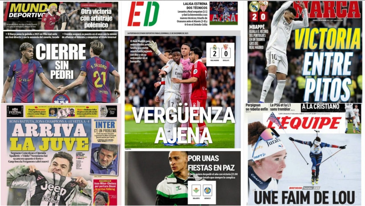 Las portadas del domingo 21 de diciembre de 2025 no esconden nada. Empezando por el ámbito nacional, y pese a que el Real Madrid venció 2-0 al Sevilla, el buen hacer de los hispalenses en el estadio Santiago Bernabéu no pasó inadvertido para los espectadores ni para la prensa, que destaca en gran medida los pitos que se escucharon en la casa blanca contra sus jugadores. Así, no sorprende que Marca y AS prácticamente coincidan. Los primeros abren con un claro 'Victoria entre pitos', y los segundos no se quedan atrás con un 'Muchos goles y muchos pitos'.