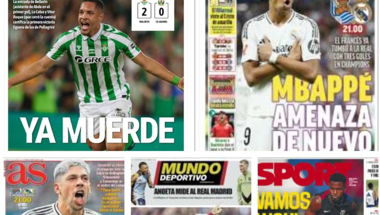 El Real Betis es el gran protagonista de las portadas nacionales tras su victoria por 2-0 ante el Leganés. Las sensaciones del Betis fueron muy buenas y lograron romper con la mala racha que atesoraba y sumar los primeros tres puntos de la temporada. Todas las miradas apuntaban a un mismo sitio, a Victor Roque que se estrenó con la elástica verdiblanca desatando la locura en la grada bética. Los otros grandes nombres del día son Mbappé y Ansu Fati. El jugador del Real Madrid supone una amenaza para la defensa de la Real Sociedad, que está a cuadros. El futbolista del Barça, en cambio, es novedad debido a que ya entrena con total normalidad y forma parte de los planes de Hansi Flick. Por otra parte, Alcaraz venció y lleva a España a la final de la Copa Davis.