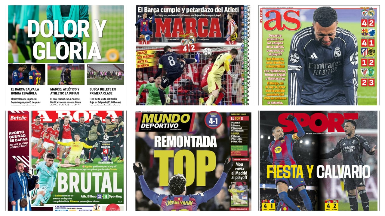 Por último, en la prensa internacional, encontramos al francés L’Equipe, que abre con los empates de PSG y Monaco ante Newcastle y Juventus, respectivamente, quedando ambos equipos fuera del ‘Top 8’, teniendo que disputar los ‘playoffs’. En el caso de Italia, La Gazzetta dello Sport recoge los resultados de sus equipos nacionales con las derrotas de Atalanta y Napoli, el empate de la Juventus y la victoria del Inter, donde solo los tres equipos del norte estarán en los ‘playoffs’. Así, el diario portugués A bola, es el que más puede celebrar, tras la victoria por 4 a 1 del Benfica ante el Real Madrid y la del Sporting CP por 2 a 3 ante el Athletic, que mantienen vivos a ‘Los Águilas’ en la competición y a los verdiblanco directamente en octavos de final.