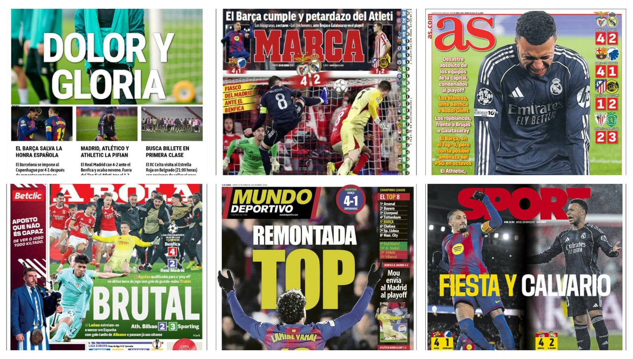 Con la ‘fase de liga’ de la Champions League finalizada, los partidos de la octava ronda dejan grandes titulares, como las dolorosas derrotas de Real Madrid y Atlético de Madrid, además de la remontada del FC Barcelona. Con la llegada de las eliminatorias de la máxima competición europea de clubes, la prensa deportiva toma el fútbol internacional como el principal tema del día
