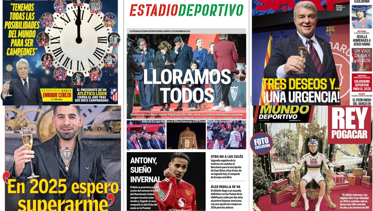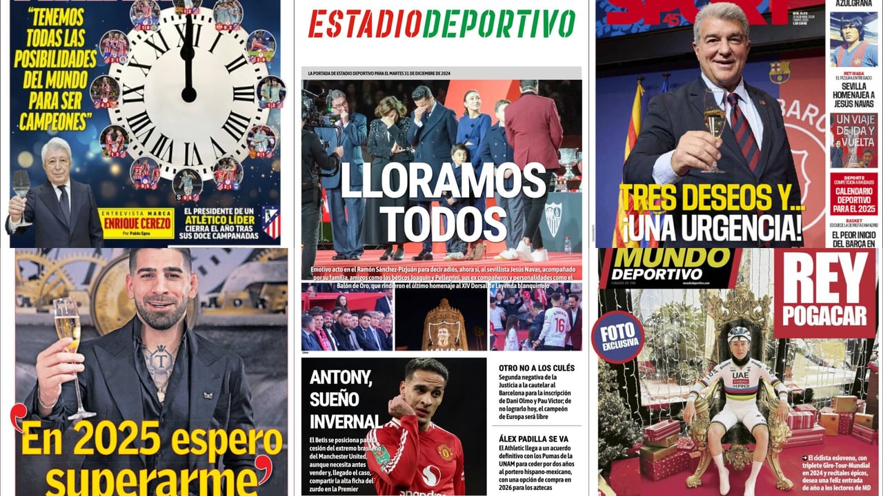 Las portadas de este último día del año, martes 31 de diciembre de 2024, llegan con muchísima información y actualidad donde lo más destacado fue el acto de despedida de Jesús Navas, que pudimos vivir en directo en ESTADIO Deportivo y llevamos a nuestra portada con una sobrecogedora imagen del palaciego junto a su familia, padres, esposa e hijos, visiblemente emocionado por todo lo vivido en la tarde de ayer en el Ramón Sánchez-Pizjuán y en el, como bien recuerda nuestro titular: "Lloramos todos".
