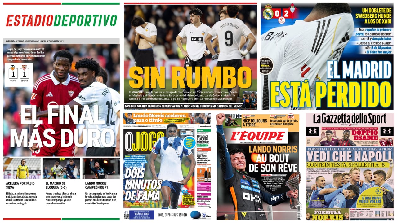 El repaso de prensa a las portadas de los principales periódicos deportivos en este festivo lunes, día 8 de diciembre de 2025, tiene entre sus principales nombres propios a los del flamante campeón del mundo Lando Norris, del deseado fichaje invernal Fábio Silva o del gravemente lesionado Luuk de Jong. No obstante, el protagonismo en los quioscos se lo lleva la crisis del Real Madrid, que sólo ha sumado tres puntos de 12 ante Elche, Rayo Vallecano, Girona y Celta; así como la navegación sin rumbo que llevan Valencia CF y Sevilla FC, que se enfrentaron en Mestalla con un reparto de puntos que no les sirve a ninguno de los dos.