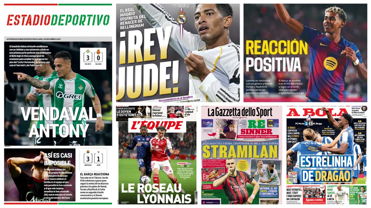El repaso de prensa a las portadas de los principales periódicos deportivos en este lunes, día 3 de noviembre de 2025, ofrece nombres propios como los de Antony Matheus dos Santos y Lamine Yamal, quienes este pasado domingo encarrilaron los holgados triunfos del Real Betis y del FC Barcelona en la jornada 11 de LaLiga; así como el de Jude Bellingham, que ha recuperado un altísimo nivel tras recuperarse de su lesión, o el del tenista italiano Jannick Sinner, que se hizo con el Master 1.000 de París para alzar el título número 23 de su carrera y arrebatarle el número 1 de la ATP al español Carlos Alcaraz. También destaca los recurrentes castigos al Sevilla FC, que se mantiene como el equipo con más penaltis en contra y el más amonestado del campeonato español.