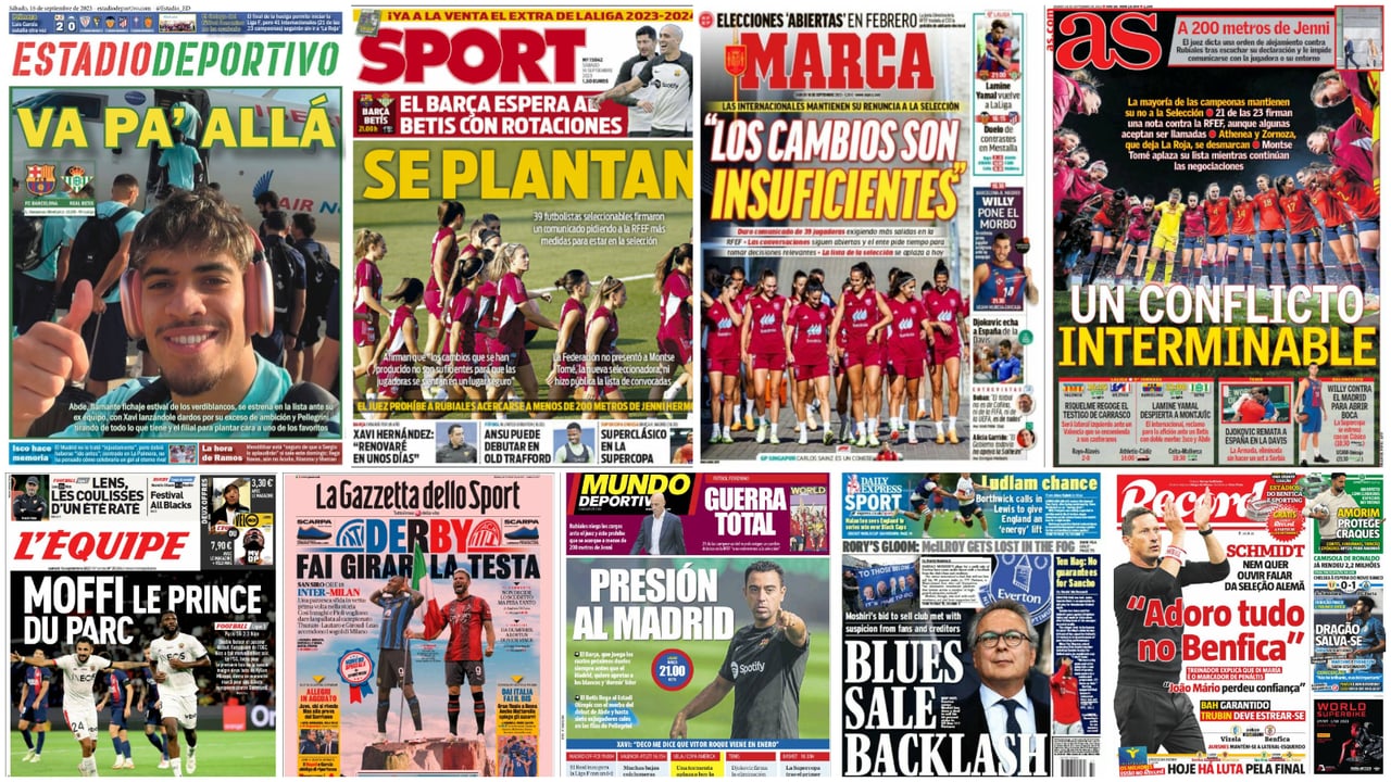 La persiana del mercado estival de fichajes por fin echó el cierre y ya es pasado, atrás quedaron los compromisos de las selecciones internacionales, acabó el parón y regresó LaLiga EA Sports con un Rayo-Alavés (2-0), pero lo que no tiene fin es el conflicto desatado entre la Real Federación de Fútbol (RFEF) y las jugadoras de la selección española femenina. Tras la tardía dimisión de Luis Rubiales, las campeonas del mundo exigen cambios reales y no se conforman con ver simples movimientos de piezas que, como en 'El gatopardo' de Giuseppe Tomasi di Lampedusa, cambie todo sin cambiarlo nada. El plante de las internacionales destaca en el repaso de prensa a las portadas de los principales periódicos deportivos en este sábado, día 16 de septiembre de 2023, en el que también destacan el viaje de Abde para el encuentro entre FC Barcelona y Real Betis; la memoria de Isco Alarcón o la irrupción en la Premier League de los americanos del Sevilla FC, que se han hecho con el Everton FC a golpe de talonario.