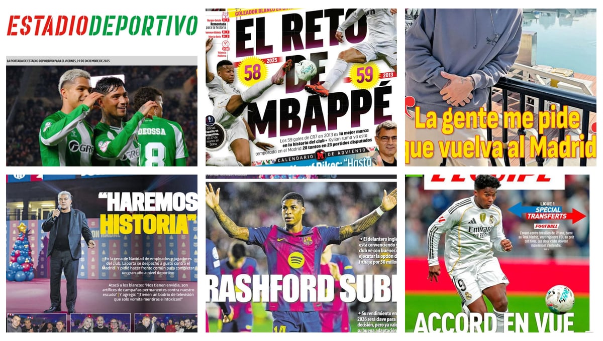 Las portadas de los medios de comunicación deportivas llegan marcadas este viernes 19 de diciembre de 2025 por los partidos de Copa del Rey disputados este pasado jueves en los cuales Real Betis y Athletic Club consiguieron su pase a los octavos de final del torneo copero. Algo que no logró el Getafe CF que cayó frente al Burgos CF. Por otro lado, la Copa del Rey trae consecuencias en el Sevilla FC cuya eliminación hace que la dirección deportiva intensifique la búsqueda de un delantero. Por otro lado, también hay espacio para la marcha de Endrick del Real Madrid y el reto que tiene Mbappé en esta recta final de año.
