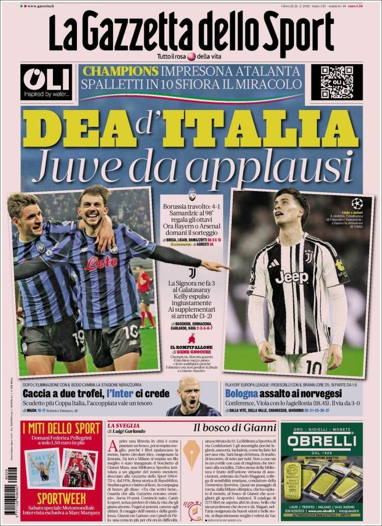 En el caso de Italia, La Gazzetta dello Sport vive el lado feliz y también amargo de las eliminatorias. El Atalanta pudo superar al Borussia Dortmund con un gol en el minuto 98, mientras que la Juventus cayó a manos del Galatasaray.