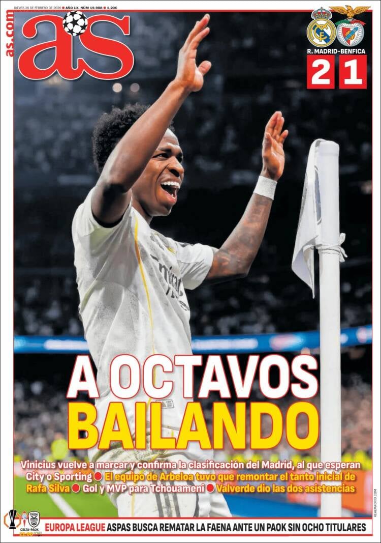 En el caso de la prensa madrileña, las portadas abren con el triunfo del Real Madrid sobre el Benfica por 2 a 1. Marca decide titular “Vini invita a otra ronda”, haciendo hincapié en los dos tantos decisivos del brasileño para firmar el pase a octavos, mientras que As recuerda la polémica vivida durante la ida en el Estadio Da Luz para escribir “A octavos bailando” sobre una foto del ‘7’ blanco.