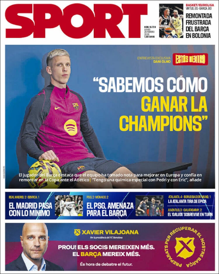 Las portadas de este jueves 26 de febrero vienen marcadas por los resultados en los ‘playoffs’ de acceso a los octavos de final de la Champions League. El Real Madrid volvió a imponerse por la mínima ante el Benfica y pasa a una ronda donde ya le esperaban Barcelona y Atlético de Madrid. Por otro lado, la semana de descanso de fútbol catalán ha permitido la realización de entrevistas donde Eric García y Dani Olmo son los protagonistas. Todo ello mientras nos acercamos al inicio de la jornada 26 en LaLiga.