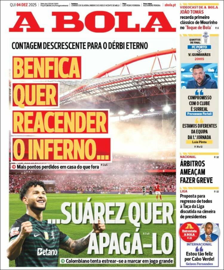 Finalmente, en los medios internacionales, hay variedad de eventos entre las portadas. En Francia, el diario L’Equipe abre con el Mundial de Rugby de 2027. Por su parte, el portugués A Bola trata el derbi entre Benfica y Sporting de Lisboa disputado el viernes en la liga portuguesa. Y, por último, en Italia, La Gazzetta dello Sport, muestra la contundente victoria del Inter de Milán frente al Venecia por 5-1 en los octavos de final de la Copa italiana.