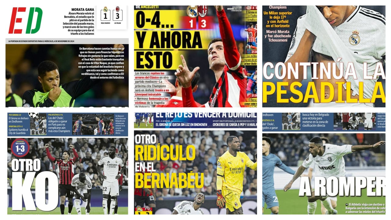 Las portadas de los medios de comunicación deportivos señalan este 6 de noviembre de 2024 la derrota del Real Madrid contra el Milan en la jornada 4 de la UEFA Champions League como la principal noticia del día. El equipo blanco está en crisis de juego y resultado y no termina de encontrar el mejor nivel que en los últimos años lo han convertido en el mejor equipo del mundo. Por su parte, en el Betis se está centrado en la continuidad de Vitor Roque mientras que en el Sevilla hay dudas con el rendimiento de Marcao.