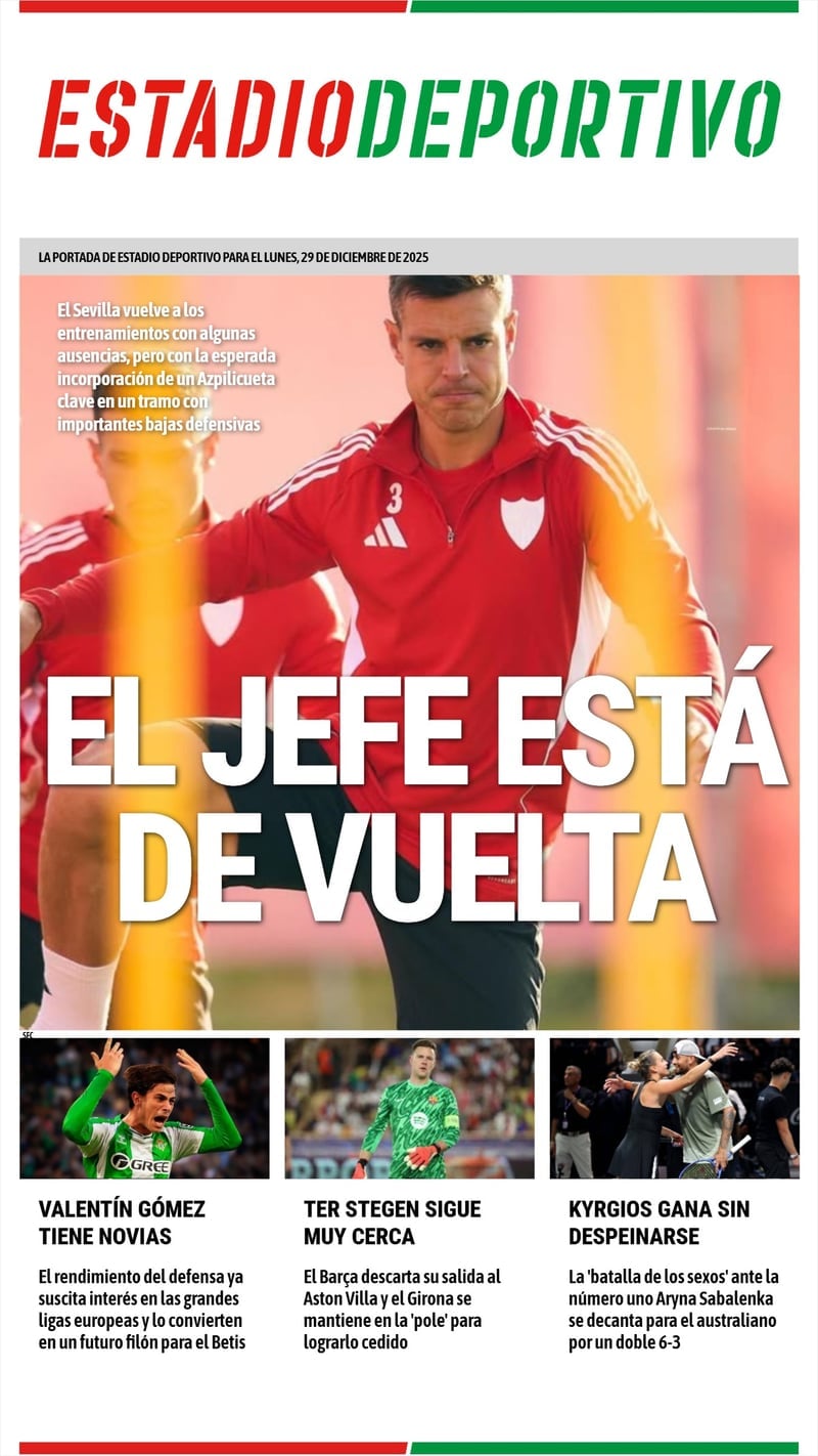 'El jefe está de vuelta' es el titular de la portada de hoy en ESTADIO Deportivo, con el regreso de Azpilicueta, ya recuperado de su última lesión, en la vuelta al trabajo del Sevilla FC después de las vacaciones navideñas. Su regreso llega justo cuando Marcao Teixeira ha sido castigado con seis partidos de sanción y sin noticias aún sobre la recuperación de Tanguy Nianzou, que también se dejó ver con el grupo. Además, en la primera página de ED también puede leerse un 'Valentín Gómez tiene novias'; pues el rendimiento del joven defensa argentino ya suscita interés en las grandes ligas europeas y lo convierten en un futuro filón económico para el Real Betis.
