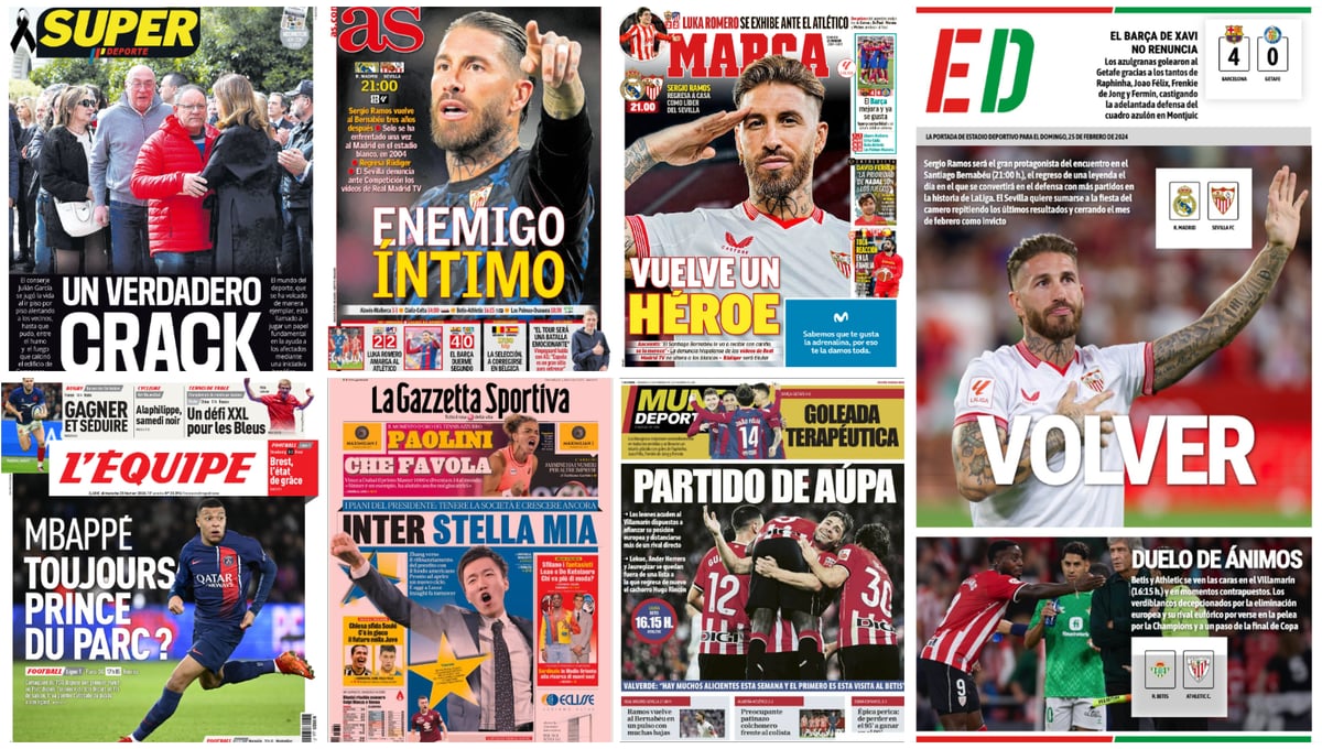 Sergio Ramos es el indiscutible nombre propio en el repaso de prensa con las portadas de los principales periódicos deportivos en este domingo, 25 de febrero de 2024 o, lo que es lo mismo, en el día del regreso del central del Sevilla FC al Santiago Bernabéu para jugar contra el Real Madrid por primera vez en dos décadas y para pisar ese césped después de casi cuatro años, con dos cursos en el PSG y su posterior regreso a la entidad en la que se formó como canterano. El camero jugó de merengue durante 16 temporadas, ganó todos los títulos posibles con una importancia capital en muchos de ellos y lució el brazalete de capitán, legado que no olvida la afición blanca, que hoy le recibirá con honores en el partido que enfrenta a los dos equipos más importantes de la vida del '4' en la jornada 26 de LaLiga. El 'duelo europeo' entre Real Betis y Athletic Club en el Benito Villamarín, la goleada del FC Barcelona ante el Getafe CF (4-0) y el empate del Atlético de Madrid en su visita al colista UD Almería (2-2) son otras de los protagonistas del día con permiso de la histórica remontada del RCD Espanyol en Eibar y, sobre todo, de Don Julián García, el conserje del bloque de viviendas incendiado en Valencia que salvó muchas vidas. Él es 'Un verdadero crack'.