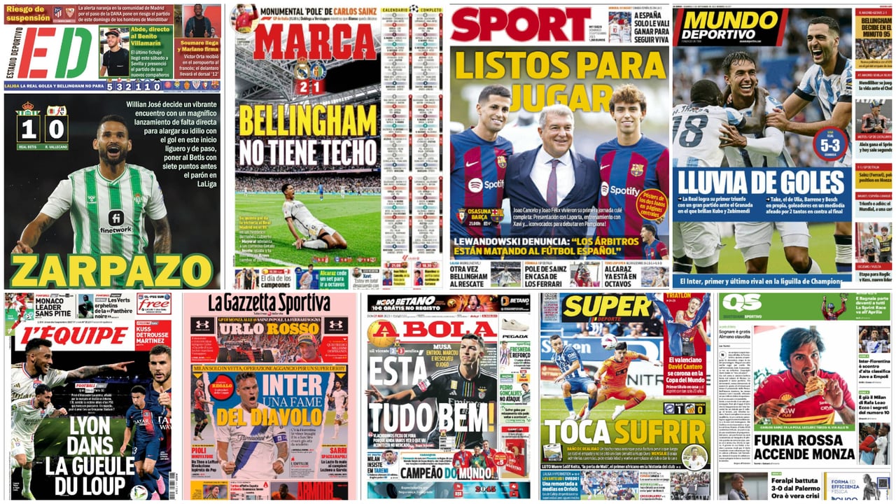 El repaso de prensa a las portadas de los principales periódicos deportivos deja varios nombres propios: el de Willian José, que anotó su tercer tanto en cuatro jornadas y se ha convertido en el principal referente ofensivo del Real Betis; el de Jude Bellingham, héroe absoluto del Real Madrid con su quinto tanto, este último sobre la bocina para dar el triunfo ante el Getafe CF; o el de Joao, en este caso por partida doble, por Cancelo y por Félix, presentados ayer como nuevos futbolistas del FC Barcelona. Además, España está muy pendiente de la DANA que azota la península y que pone en riesgo la disputa del duelo de esta tarde entre Atlético de Madrid y Sevilla FC. Fuera del fútbol, es día de Fórmula 1; de Mundial de Baloncesto, con partido decisivo para la selección española ante la de Canadá; de La Vuelta ciclista, que disputa su novena etapa...