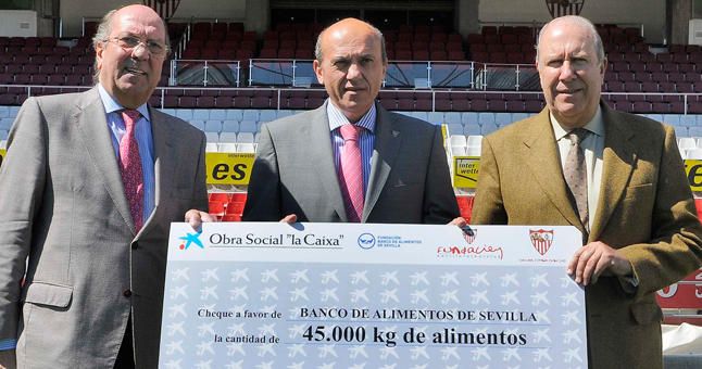 El presidente el Sevilla, José María del Nido, hizo entrega en la mañana de hoy junto con el director territorial de La Caixa, Juan Reguera, del cheque simbólico por los 45.000 kilos de alimentos recogidos al presidente del Banco de Alimentos de Sevilla, Juan Pedro Álvarez.