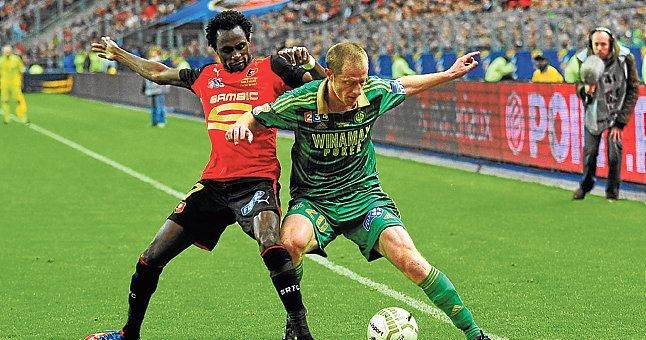 El jugador del Rennes Jonathan Pitroipa (a la izquierda) pugna con el futbolista del Saint-Étienne Jonathan Brison.A.T.