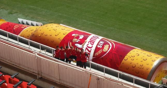 Los banquillos del Pizjuán se convierten en... botellas de Cruzcampo