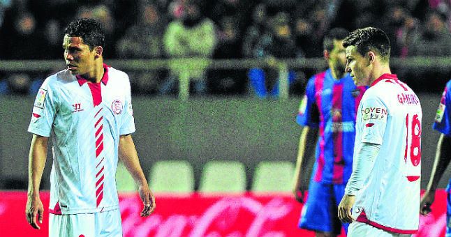 En la sala de prensa, se le cuestionaba a Emery el sábado por quién es mejor acompañante para el ex del Schalke: si, no estando M´Bia, debía ser Iborra en lugar de Carriço, para que el portugués formara pareja en la zaga con Fazio. Resulta obvio que el argentino se siente más seguro al lado de Carriço, pero el problema de este Sevilla con 4-4-2 está más arriba: en la delantera. Ante el Levante, actuaron Bacca y Gameiro desde el inicio. No sólo porque son los mejores, sino porque son los únicos que quedan. Ninguno, sin embargo, estuvo bien. Y no sólo ante el Levante, sino que esta circunstancia se repite cada vez que están ambos sobre el verde. Ni se buscan, ni se encuentran. Apoyan esta teoría los datos. El sábado, fueron los hombres de campo que menos balones tocaron y sólo realizaron dos disparos a puerta cada uno, aun teniendo el Sevilla un abrumador 80% de posesión durante algunos compases del encuentro. La falta de entendimiento entre ambos, además, es absoluta. Gameiro le dio un único pase a Bacca y éste, seis al galo, si bien cuatro de ellos fueron en saques desde el centro del campo: tres tras los goles del Levante y otro al comenzar la segunda parte, cuando le tocaba poner el cuero en juego a los nervionenses.