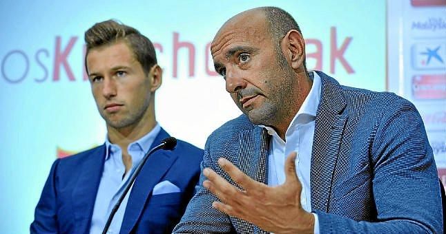 Monchi, durante la presentación de Krychowiak y Arribas; el polaco, a su derecha.Redacción