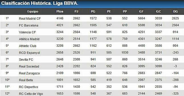 El conjunto de Nervión está a diez puntos de los pericos en la clasificación histórica de la Liga BBVA, por lo que podría pasar del séptimo al sexto puesto si al final de esta campaña aventaja en diez puntos al club catalán.