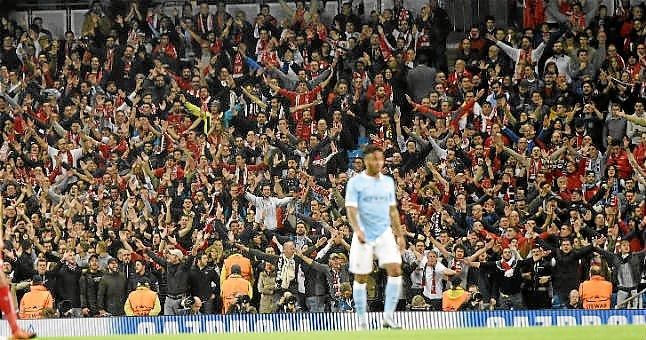 Hasta 1.200 sevillistas estuvieron presentes anoche en el Etihad Stadium. La afición, una vez más, dio ejemplo en Europa de fidelidad al equipo, tiñendo de rojo y blanco la zona visitante del estadio y animando a los suyos durante todo el partido.
