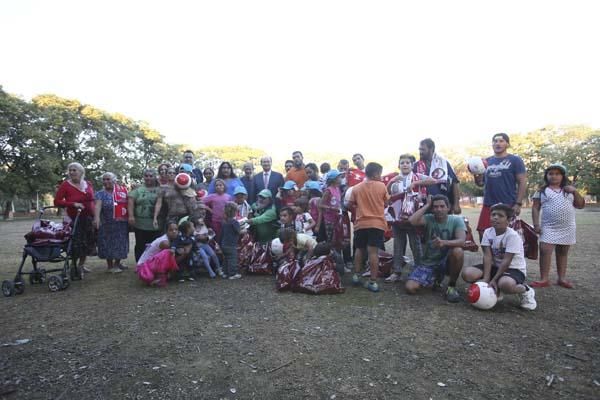 José Castro, presidente del Sevilla, en nombre de la Fundación del club ha hecho una visita y ha relagado a los más pequeños del asentamiento chabolista El Vacie material deportivo con los colores blanquirrojos.