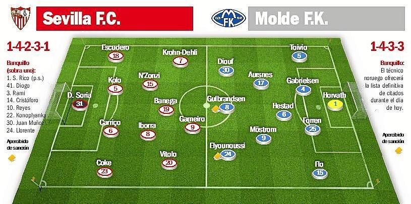 Así las cosas, Unai, con las ausencias de Krychowiak y de Pareja, dispone de múltiples alternativas dentro de una política de rotaciones que, en esta ocasión, podría alcanzar a la portería, con opciones para David Soria. En los laterales se producirá un nuevo cambio integral, quedándose fuera de la lista Mariano y Trémoulinas, mientras que al centro de la zaga volvería Carriço en detrimento de Rami o de Kolo en tanto en cuanto Fazio no ha entrado entre los 19 elegidos. Para el doble pivote también tres nombres (Iborra, N´Zonzi y Cristóforo) para dos puestos, y en global la incógnita de si apostará por dos puntas al citar a los tres de la plantilla. Si jugara con uno, la lentitud de la retaguardia del Molde otorgaría ventaja a Gameiro, que, con su velocidad, podría clavar el primer estandarte sevillista en la cruzada por su trono.