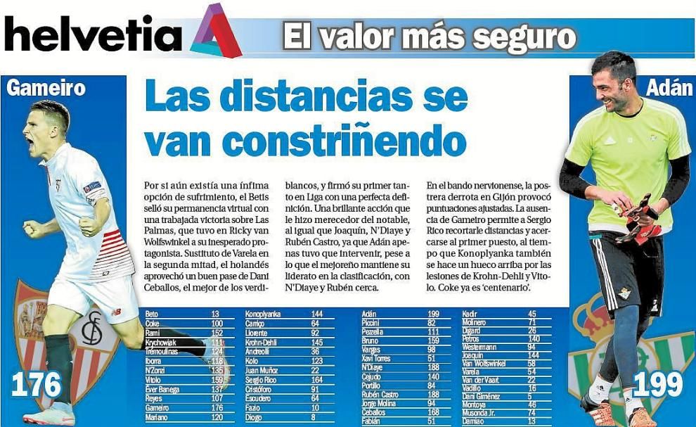 Por si aún existía una ínfima opción de sufrimiento, el Betis selló su permanencia virtual con una trabajada victoria sobre Las Palmas, que tuvo en Ricky van Wolfswinkel a su inesperado protagonista. Sustituto de Varela en la segunda mitad, el holandés aprovechó un buen pase de Dani Ceballos, el mejor de los verdiblancos, y firmó su primer tanto en Liga con una perfecta definición. Una brillante acción que le hizo merecedor del notable, al igual que Joaquín, N´Diaye y Rubén Castro, ya que Adán apenas tuvo que intervenir, pese a lo que el mejoreño mantiene su liderato en la clasificación, con N´Diaye y Rubén cerca.