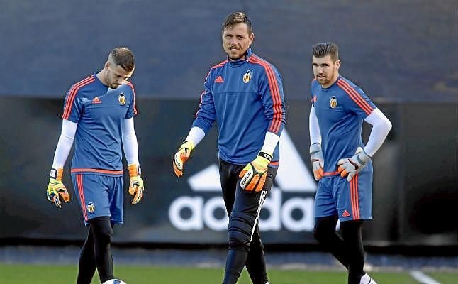 Diego Alves, en un entrenamiento junto a sus compañeros y rivales por la portería che.A. Sáez